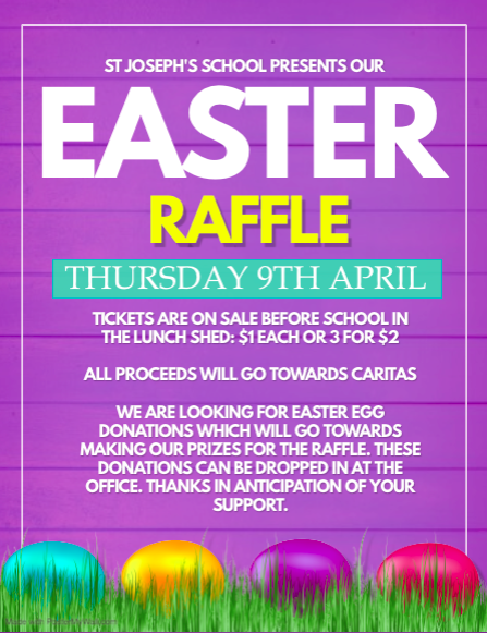 Tickets for our Easter Raffle can be purchased in the lunch shed each morning (before school) from Wednesday 4th March. Tickets will be $1 each or 3 for $2. We are also looking for Easter Egg donations to go towards the raffle prizes. Donations can be brought to the office. Thank you in anticipation of your support for this worthy cause.